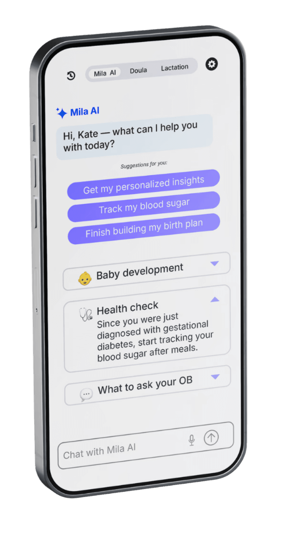 Mila adapts to your stage, questions, and decisions - offering quick reassurance, deeper guidance, and real conversations when it matters most.